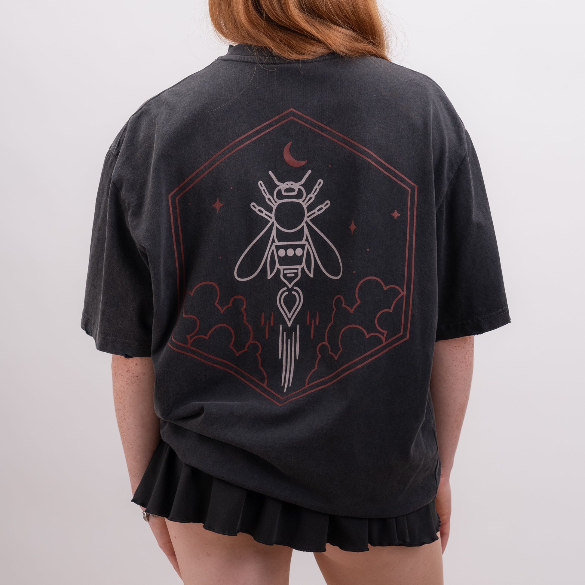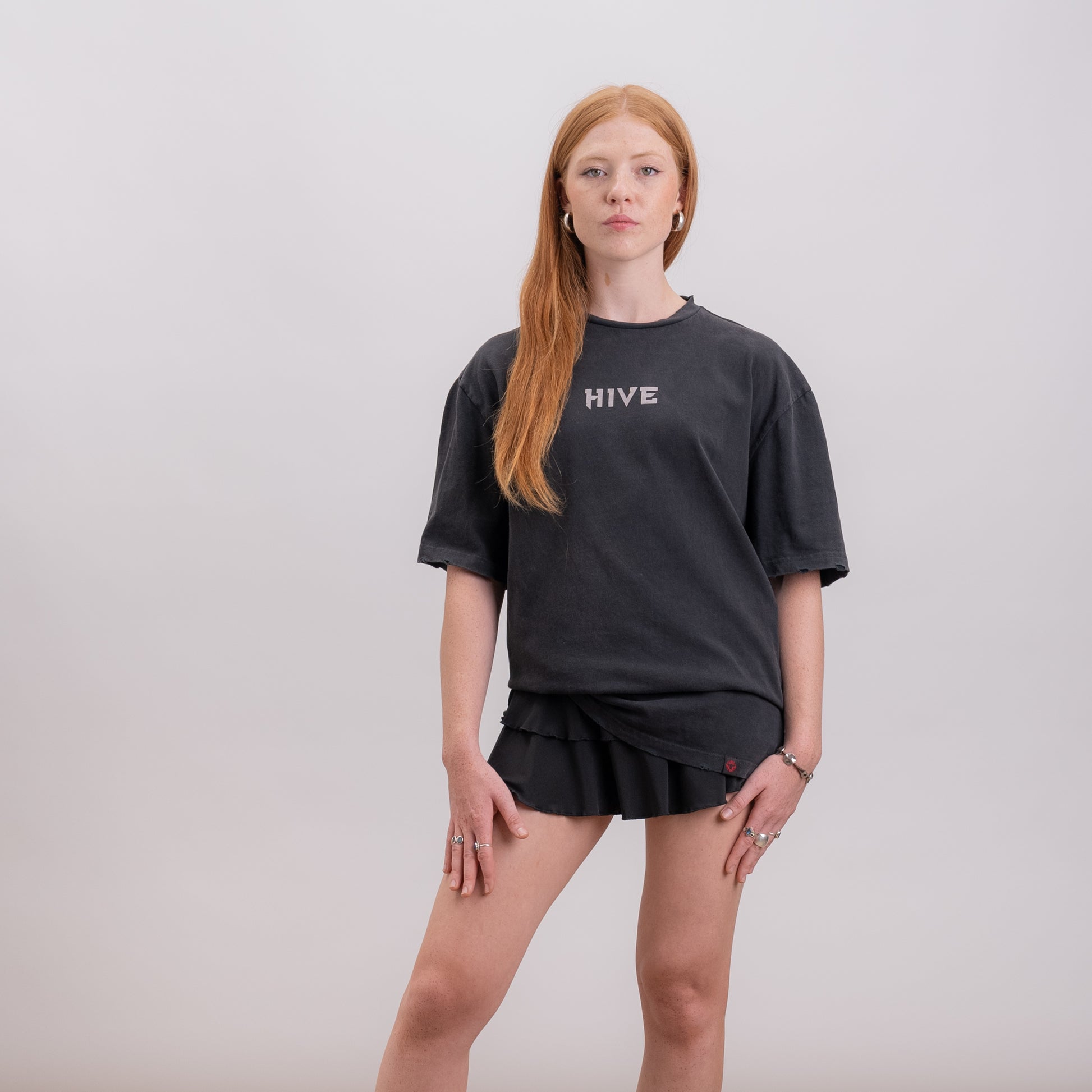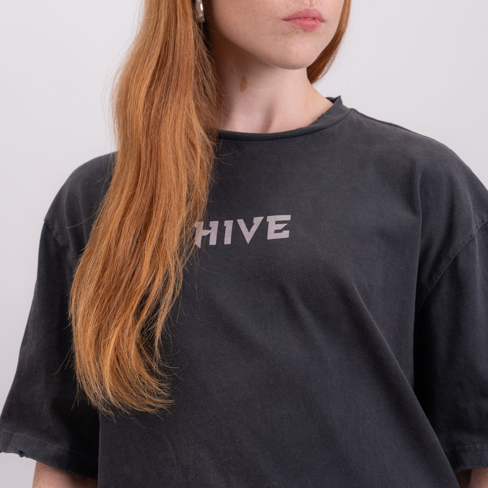 A club ready heavy-washed and distressed shirt with white vintage HIVE logo that stands out in the crowd.