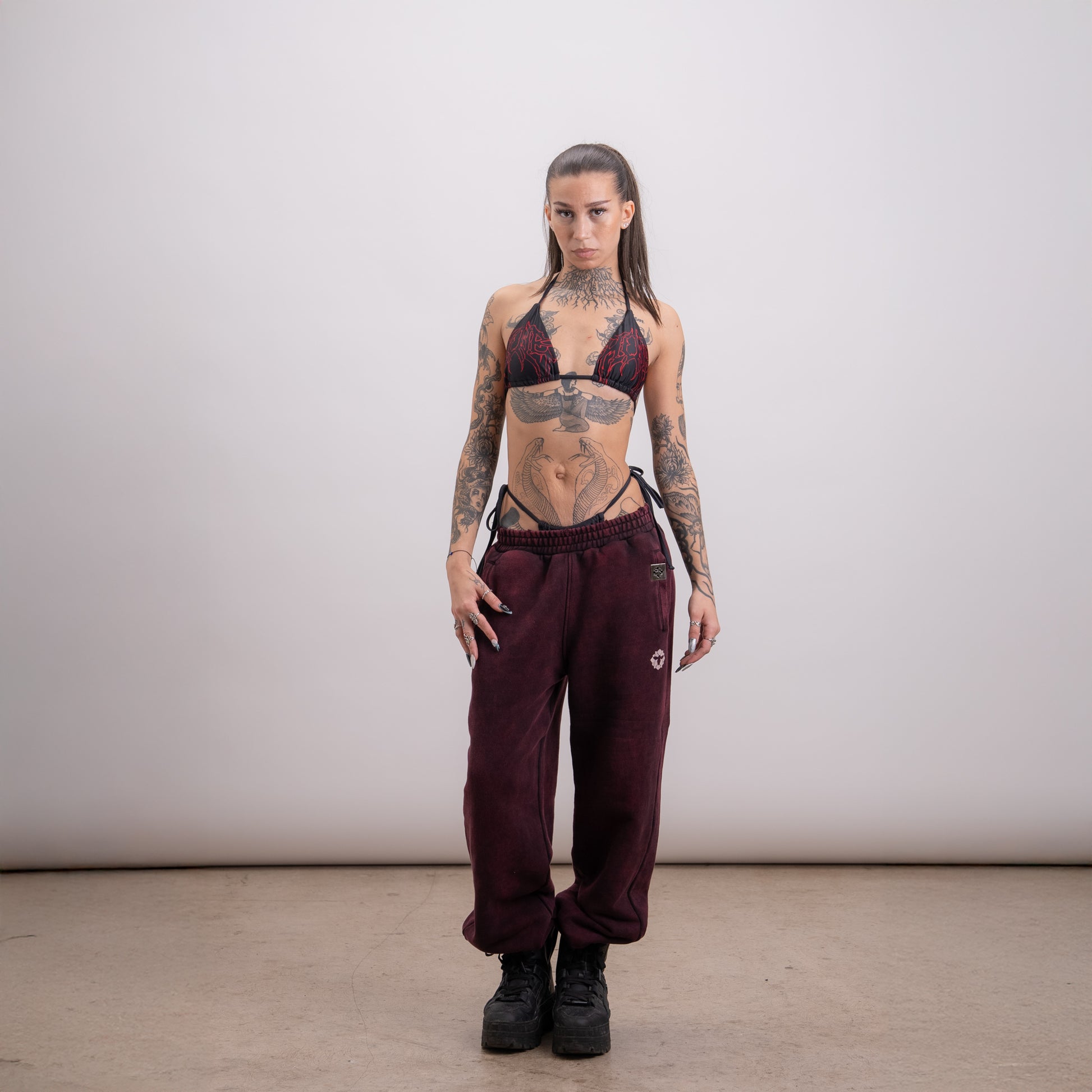 Black bikini built for motion with an red HIVE tribal logo for a sharp pop. Comfy hold that stays put from pool to dance floor.