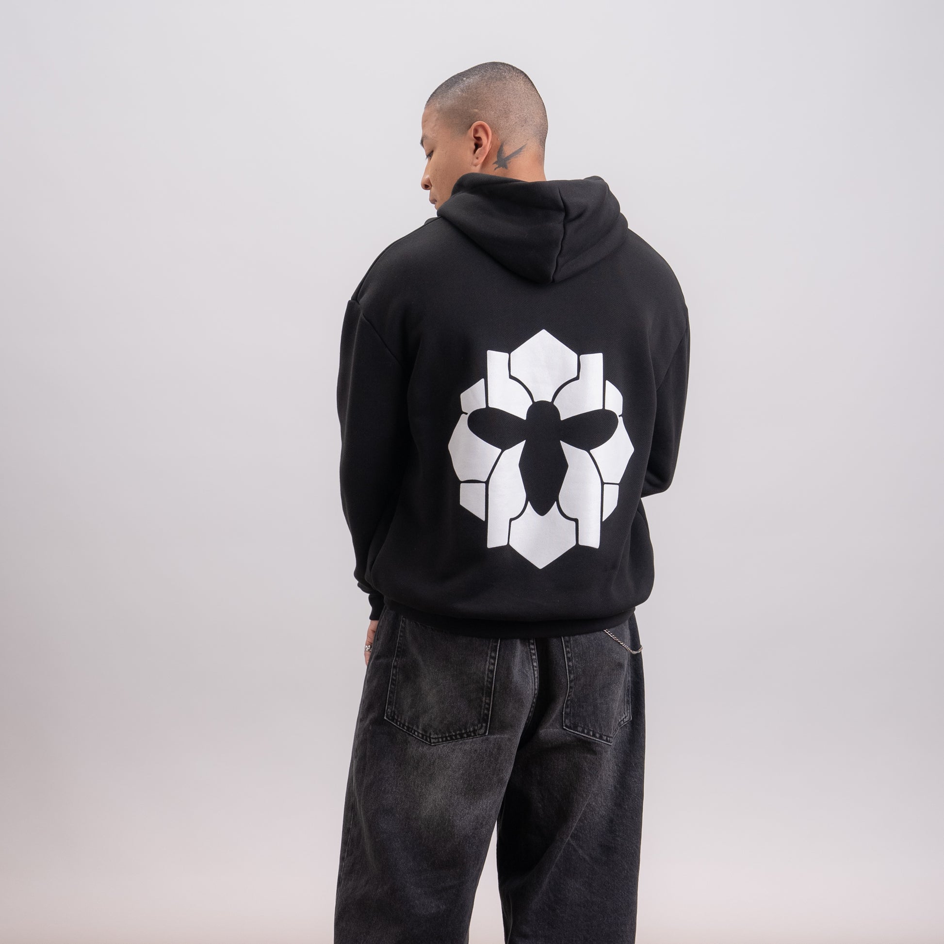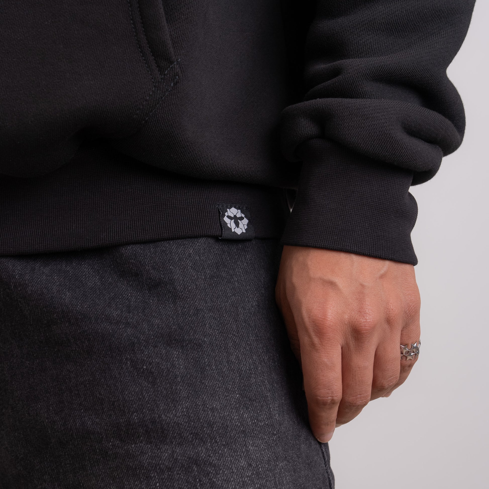 Your everyday layer for rave season. Black, oversized hoodie that keeps you warm after a long night.