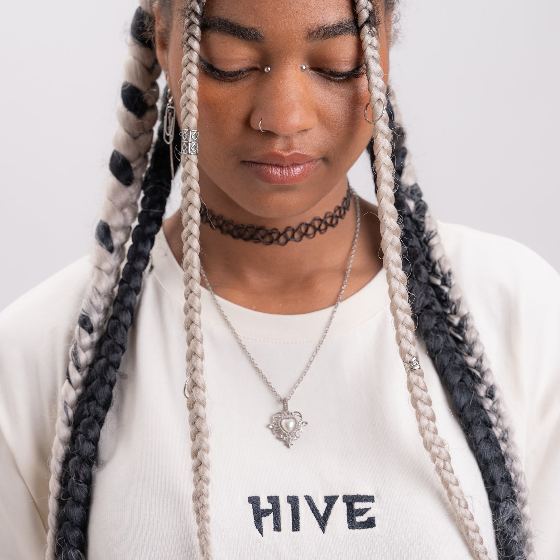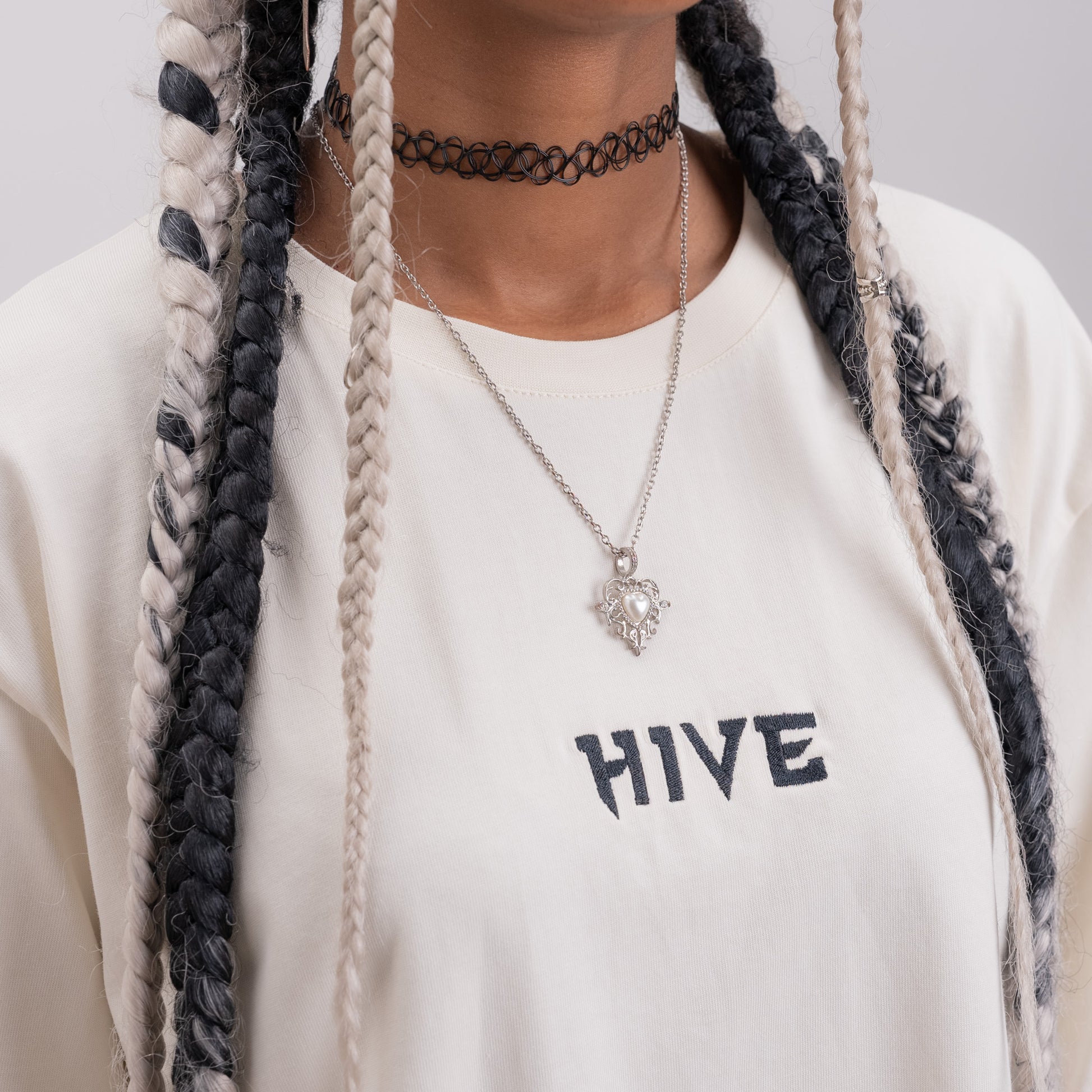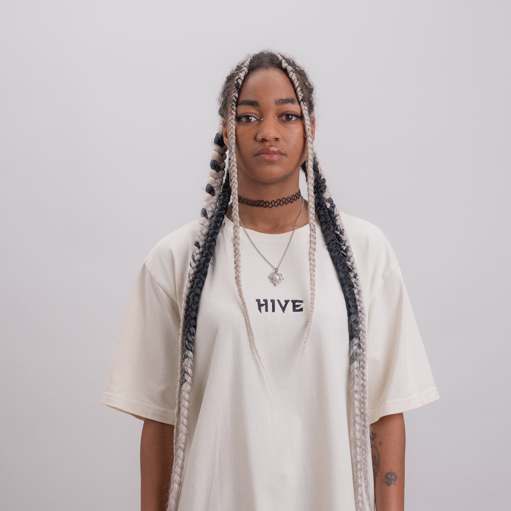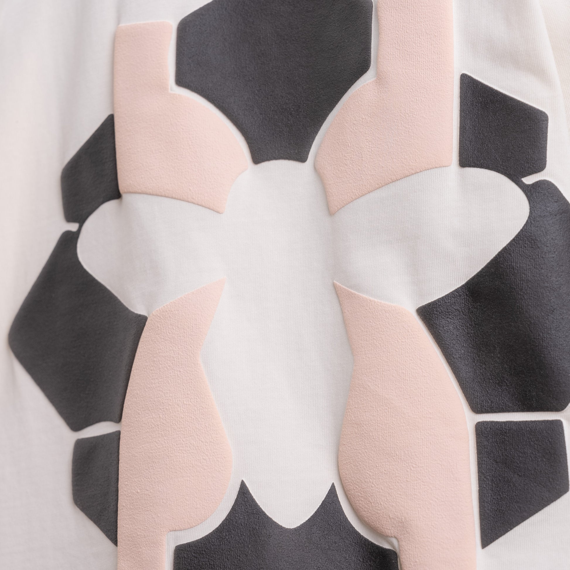 Beige, oversized t-shirt with attitude and 3D optic in black/pink that stands out in the crowd.